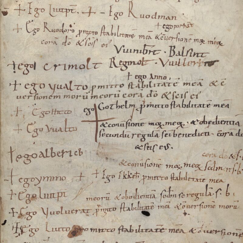 In den Urkunden im Ausstellungssaal vermachten Menschen aus Sorge um ihr «Seelenheil» ihren Besitz dem Kloster St.Gallen. Die angehenden Mönche schrieben ins Professbuch ihr Mönchsgelübde. Ego promitto, «ich verspreche», lautete die Formel, mit der sie versprachen, ihr weltliches Leben für ein Leben im Kloster aufzugeben. Dazu wechselten sie Namen, Frisur und Kleidung. Anhand von wenigen ausgewählten Exponaten diskutieren wir, ob und wie man sein Ego ändern kann.